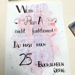 Im drei- oder vierstündigen Kurs lernen die Teilnehmer/innen die wundervolle Kunst des Handletterings. Der Kurs vermittelt Grundlagen zur Gestaltung eines Bildes bzw. Posters durch den Einsatz von ganz unterschiedlichen Schriften und Gestaltungselementen. Auch die "Erfindung" eigener Schriften ist möglich und wird unterstützt. Begleitet wird die Schrift durch den Einsatz wundervoller Aquarelltechnik. Ziel es des Kurses ist es, so viel zu lernen, dass man dies zu Hause allein weiter führen kann - und z.B. zur Gestaltung von Einladungskarten, Geschenken, Beschriftungen von Ordnern o.ä. nutzen kann. Die Einsatzmöglichkeiten sind riesig. Jeder hält am Ende des Kurses fertige Ergebnisse in der Hand.