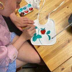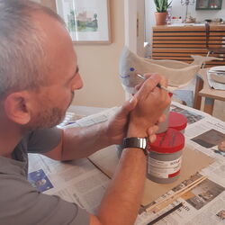 Gleich im Anschluss an das Töpfern findet das Bemalen statt. Bemalt wird mit Engobe (Flüssiger Ton mit Farbpigmenten), so dass ein 2. Besuch zum Glasieren der Werke nicht nötig ist. Nach dem ersten Brand tauche ich die Werke in Transparentglasur und brenne alles ein zweites Mal. Ca. 4 Wochen später können alle Kunstwerke abgeholt (oder zugeschickt) werden.
